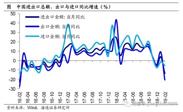 2月我国以美元计价出口同比大降至-20.7%(前值9.1%)。2月海外主要发达经济体景气度均在走弱,欧、日指数跌破荣枯线,韩国2月均大幅下滑,指向全球贸易或在降温。剔除春节造成的波动,1-2月我国出口金额累计增速-4.6%,与18年12月大体持平,说明出口维持弱势。