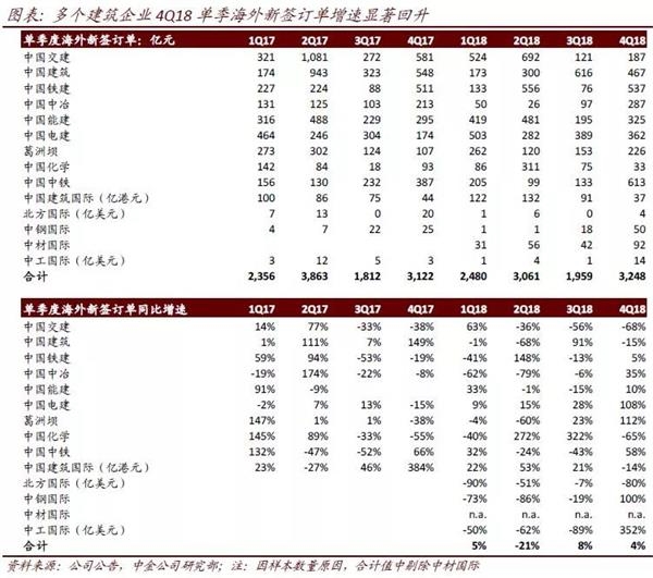 随着中美贸易摩擦逐渐缓和,国际政治经济形势趋于稳定,2018年第四季度,多个建筑企业海外新签订单增速有所回暖(部分企业上年基数较低);2019年1-2月,中国中冶、中国化学、中国电建海外新签订单分别同比增长167.0%、77.5%、23.0%,国际工程投标步伐有所加快。我们预计2019年这一趋势有望得到延续。