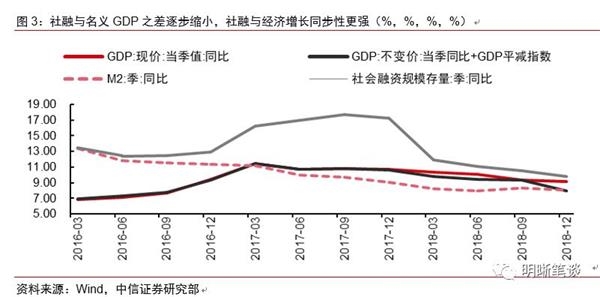 M2和社融增速与名义GDP相匹配意味着政府希望未来货币增长与经济增长相匹配。根据古典货币理论,名义GDP的增速等于实际GDP增速加上通货膨胀的增速。当与名义GDP相匹配,即M2增速=GDP增速+增速时,货币信用条件最为合理。从2018年的数据来看,M2增速为8.1%,社会融资规模增速为9.8%,名义GDP同比增长为9.7%,CPI同比增长为2.1%,基本满足上述条件,未来货币增长与实体经济名义增长相一致。