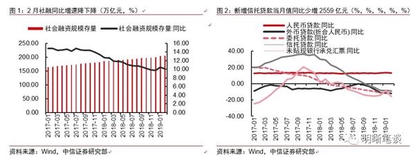 1-2月社融增量显著提高。受季节性因素影响1月份社融增幅大幅提高。受季节性因素影响1月份社融增幅大幅提高。2月受春节假期以及票据监管趋严影响社融同比增速降下降。新增人民币贷款7030亿元,同比少增2559亿元;新增委托贷款和信托贷款均为负值,表外非标融资进一步萎缩,新银行承兑汇票达-3103亿元,同比增速维持在负区间。