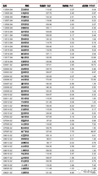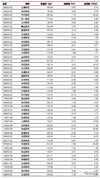 3月19日转债市场,平价指数收于103.67点,上涨0.95%,转债指数收于117.19点,上涨0.22%。124支上市可交易转债,除海尔转债、亚太转债、新凤转债、众兴转债横盘外,94支上涨,26支下跌。其中广电转债(13.66%)、华源转债(11.61%)、湖广转债(7.75%)领涨,横河转债(-6.02%)、景旺转债(-1.78%)、金禾转债(-1.58%)领跌。124支可转债正股,除洪涛股份、辉丰股份、博世科、吴江银行、海澜之家横盘外, 64支上涨,54支下跌。其中,华源控股(10.06%)、湖北广电(10.00%)、广电网络(9.98%)领涨,横河模具(-8.99%)、金禾实业(-6.89%)、赣锋锂业(-2.96%)领跌。