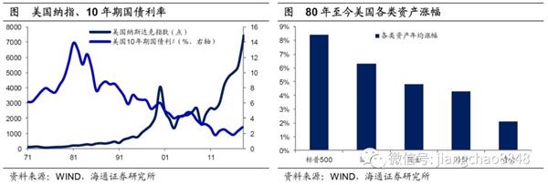 美国80年以后:股债双牛、房价跑输现金。但事后来看,《商业周刊》的这个判断其实是大错特错。从1980年初到现在,标普500指数涨幅高达25倍,年均涨幅高达8.4%。而同期持有10年期国债的年均回报率大约为6.3%,货币利率均值大约为4.8%,而持有房产的年均回报率仅为4.3%(新房销售中间价涨幅),持有黄金的年均回报率仅为2.1%,这说明在过去的40年在美国投资股票资产是最佳选择,而黄金和房产其实是表现最差的资产、连现金都跑不赢。