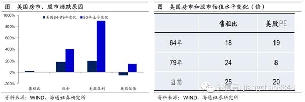 股市估值提升,盈利远胜租金。为什么会有这样的变化?我们以1980年为界来观察前后美国股市和房市的表现,同时我们将每一种资产价格的表现分为盈利和估值,股价分成企业盈利和市盈率,房价分为房租和房价租金比。可以发现,虽然在80年代以前的20年房价大涨、而股价没涨,但关键原因并不是因为企业盈利不好。从64年到79年美国的企业盈利和房租都增长了2倍,但是同期美国的房市估值提升了30%,而股市的估值下降了60%,这就使得房价涨了3倍,而股市基本没涨。因此,80年代以前股市是输在了估值上,而并不是输在上。