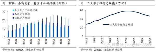 资管新规出台,收缩影子银行!而18年开始的资管新规等金融监管要求穿透式原则,这使得通道业务等监管套利无处遁形,信托、子公司、资管等影子银行载体的规模都开始大幅收缩,在过去1年三大影子银行的资管规模收缩了大约10万亿,总规模萎缩了接近20%。