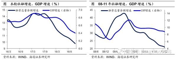 融资增速下滑:始于17年4季度。而早在17年4季度,社会融资增速就出现了明显下滑,增速从3季度的14.4%降至13.4%,此后一路下滑至18年4季度的9.8%。从历史来看,09年社融增速的回升和10年的回落也均领先于经济增速的变化。原因在于,货币是经济运行的血液,从微观来看,企业往往需要先有资金、然后才能安排投资和生产,体现在宏观层面,就是货币融资是经济增长的领先指标。而在中国当前,我们发现社会融资是经济增速的重要领先指标,领先经济变化一到两个季度左右。