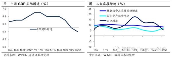 本轮经济下滑:始于18年2季度。观察本轮中国经济增速的变化,我们发现其回落始于18年2季度左右。从增速来看,在17年3季度到18年1季度都维持在6.8%的增速,但在18年2季度增速降至6.7%,此后的两个季度增速又分别降至6.5%和6.4%。从支出法来看,三大需求的下滑均出现在18年2季度。其中消费增速从9.8%降至9%,投资增速从7.6%降至5.2%,出口增速从17.6%降至12.3%。