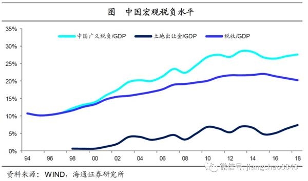 过去30年:宏观税负逐年上升。而在过去的30年,我国其实是在不断加税,自从1994年分税制改革之后,中国的宏观税负就在逐年上升,在1994年时我们的宏观税负占GDP的比重只有10%,而到了2018年这一比例已经接近30%。
