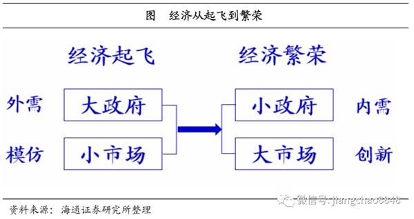 从起飞到繁荣:从大政府到大市场。在经济的起飞阶段,政府的作用功不可没,可以集中力量办大事,引进技术,发展核心产业,靠外需发展,实现工业化。但是要想实现经济繁荣,必须靠自主创新,回到内需发展,而这就要求回到小政府、大市场的方向。而减税是最关键的一步,通过减税,可以将收入还给居民部门,增加居民的消费潜力。通过减税,可以增加企业部门利润,从而增加企业的创新能力。因此,靠大政府、小市场可以实现经济起飞,而小政府、大市场才是经济繁荣的基石。