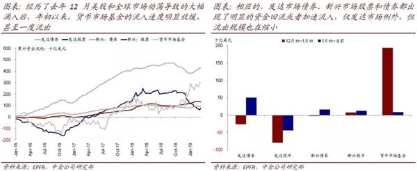 从市场基金到发达债券和新兴股债。从大的资产类别看,经历了去年12月美股和全球市场动荡导致的大幅涌入后,年初以来,货币市场基金的流入速度明显放缓,甚至一度流出。相应的,发达市场债券、新兴市场股票和债券都出现了明显的资金回流或者加速流入;仅发达市场例外,但流出规模也在缩小。