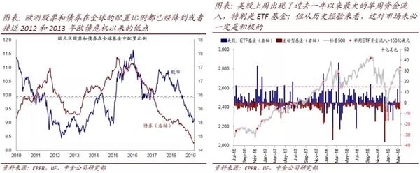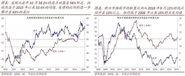 配置情况:美股回落,美债继续上行;欧洲接近危机以来低点;新兴市场有所修复。从主要资产在全球的配置情况看,1)美股从去年10月58.2%的高点回落至56%附近,但依然高于2010年以来53.4%的均值,美债的比例则进一步攀升至63%的高位。2)新兴市场股市的配置比例从2018年9月12%的低点回升至13%上方,但仍低于2008年以来15%的历史均值;相应的,新兴债市配置比例则已经修复至11%的历史均值附近。3)受持续而大幅的资金流出影响,欧洲股票和债券在全球的配置比例都已经降到或者接近2012和2013年欧债危机以来的低点。
