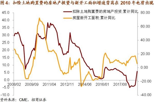 2008年至今,新开工面积增速与扣除土地购置费的地产投资增速走势大体是趋同,除了两个时间端,其一就是2018年,新开工面积增速持续上涨而扣除土地购置费的地产投资负增长;其二是2010年,当年新开工面积增速最高时达到72.4%,整体处于上升通道,而同期扣除土地购置费的地产投资增速从年初的30%以上回落至25%附近。而进入2011年,新开工面积增速大幅回落至16.2%,但扣除土地购置费的房地产投资增速最快时突破38%,直到下半年增速才开始逐步回落。
