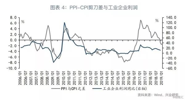 数据显示,PPI同比与CPI同比之差和工业企业利润同比走势十分接近。PPI与CPI剪刀差的收窄、转负折射出工业企业利润增速已步入下行周期。
