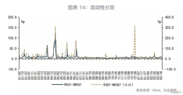 第三,流动性分层的角度(图表14)看,上周流动性分层扩大。上周R007与DR007的平均利差上升至18bp,较前一周上行约15bp。