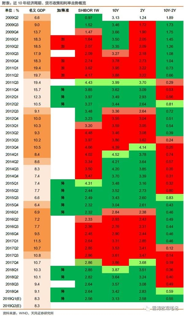 第二,经济企稳之前,货币政策基调不会发生方向性转变,整体会维持在偏宽松的状态。一方面,虽然年初以来社融增速企稳回升,但经济中的体制性、结构性问题决定了在当前环境下,对非基建地产行业、小微民营企业的宽信用仍需要偏宽松的货币政策支持。参考过去10年的情况,在名义GDP增速企稳之前,货币政策基调一般不会发生方向性转变,整体会维持在偏宽松的状态。(见文末附表)