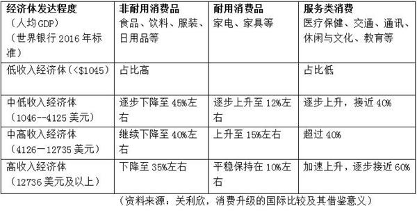 在经济发展的不同阶段,这三种类型的消费占比是不一样的。总的趋势是服务类消费占比明显上升,非耐用消费品占比下降(见附表1)。