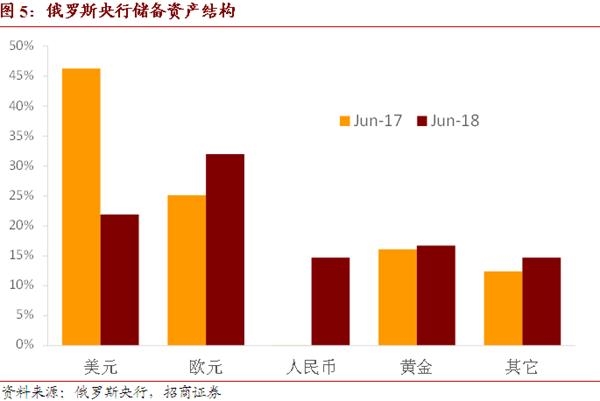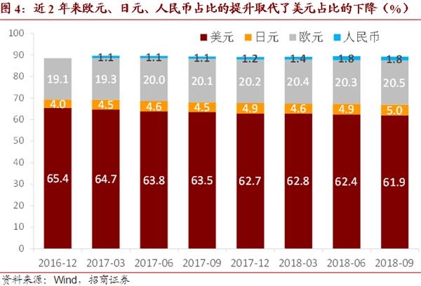 自2017开始,美元资产在各国央行外汇储备之中的占比再度出现持续下滑,从2016年末的65%下降至2018年三季度末的62%,欧元、日元以及人民币在全球央行外储中占比的提升(分别提高1.4、1.0、0.8个百分点)基本上取代了美元资产的降幅。而事实上,也正是自去年下半年开始,市场投资者才注意到全球央行以上的“去美元化”进程。
