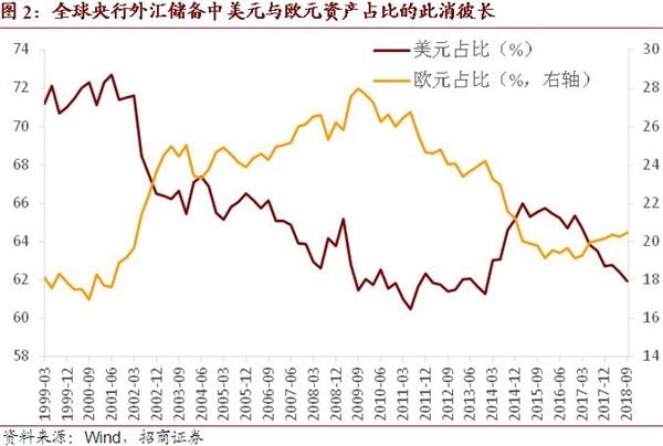 1、至少在近20年以来,全球央行的“去美元化”进程一直在持续,这受到了美国自身以及欧元推出等多方面因素的影响。欧元的“冲击”导致美元在全球央行资产中的占比由高点73%回落至2008年危机后的62%,而欧元的占比则由18%升至高点28%基本填补了美元的降幅。此后受到欧债危机、美联储退出QE等因素的影响“去美元化”出现反复,但2017开始“去美元化”再度出现,美元资产在全球央行外汇储备中的占比再度由2016年末的65%下降至2018年三季度末的62%,这一期间欧元、日元以及人民币在全球央行外储中占比的提升(分别提高1.4、1.0、0.8个百分点)基本上取代了美元资产的降幅。