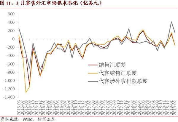 代表零售外汇市场的银行结售汇再度出现逆转由顺转逆,2月实现逆差1013亿元(1月为顺差818亿元)。其中银行自身结售汇逆差9亿元,环比收窄204亿元;银行代客结售汇逆差1023亿元(1月为顺差1031亿元)明显走弱,环比恶化幅度超过2000亿元。