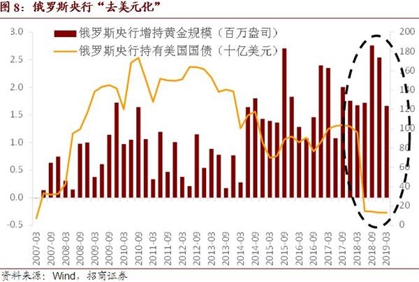 如果我们再次以俄罗斯央行为例,其明显增持了黄金以及人民币资产,2018年至今(截至今年2月末)增持黄金1754万盎司(约合497吨,占全球央行增持黄金的绝大部分),而人民币资产在其储备资产中的占比已达15%左右,绝对规模增加超过660亿美元。