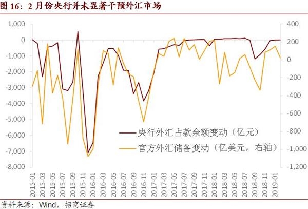 2月央行外汇占款余额变动为-3亿元,央行2月同样并未干预外汇市场符合我们的预期。2月末央行官方外汇储备余额为3.09万亿美元,环比小幅增加23亿美元,根据我们的测算,汇率折算因素与资产价格变动仍是外储余额变动的主因。