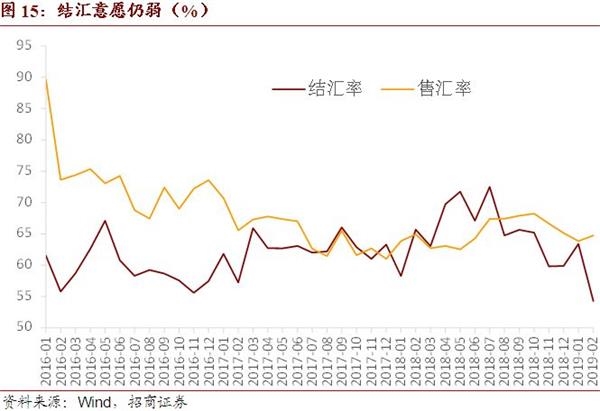 从结售汇率的变动情况来看,2月份结汇率环比大幅下降9个百分点至54%,售汇率环比抬升1个百分点至65%,从单月数据来看汇率预期再度出现明显弱化,如果同样综合1-2月数据来看,结汇率为60%、售汇率为64%,相较去年12月基本保持稳定。