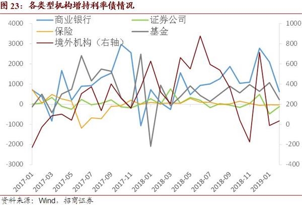 分机构情况来看,2月与境外机构一同增持债的有商业银行(+626亿元)、(+225亿元),但后两者的增持力度均出现了明显下降。证券公司、保险2月份继续减持利率债,减持规模分别为116亿元、31亿元。