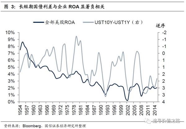 美国收益率曲线的倒挂一直被认为是经济衰退的先导指标。从历史数据来看,自1952年以来,美国每一次出现国债收益率曲线倒挂的现象,往往会成为经济衰退的前兆。对股票市场来说,由于长短期国债利差与企业ROA存在显著的负相关关系,因此期限利差也是预判股票市场走势重要参考指标。但需要特别注意的是,虽然期限利差的预测效应在长期来看是成立的,但短期从“利差倒挂”到“经济衰退”所经历的过程和时滞要远超想象,几个季度甚至几年的背离都很正常。纵观80年代以来的三次衰退,期限利差的倒挂领先经济衰退1-2年不等,而在利差倒挂刚开始发生的时候,经济的扩张周期往往并未走完,股票市场的走势也并不一定受到利差倒挂的影响,甚至很有可能走出大牛市的行情。最典型的例子是1998年9月左右美国出现了收益率曲线倒挂,但之后一直到2000年3月是互联网泡沫中股市涨得最好的时间段。