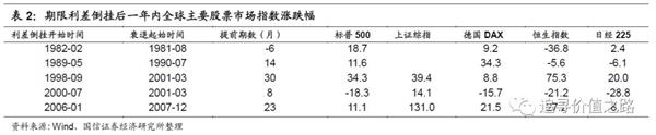 此轮经济衰退的导火索是美国次贷危机的爆发继而引发了全球经济危机,道琼斯工业指数从最高点跌幅超过50%。但如果我们看2006年初期限利差开始倒挂之后一年全球股票市场的表现,还是非常不错的,美股标普500涨幅12%,主要是盈利增长的贡献。