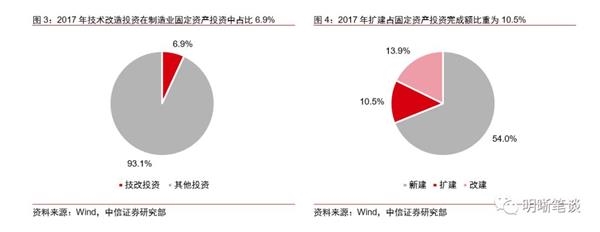 制造业技术改造支出在整体制造业固定资产投资中占比不足10%,对制造业投资拉动有限。为估算技改投资占整体固定资产投资的比重,我们将国民经济行业分类(GB/T 4754—2017)中制造业所有子行业的技术改造经费支出进行加总(由于数据缺失,不包含废弃资源综合利用业,但其占比很小可忽略),并计算其在制造业固定资产投资中的占比。2016年制造业技术改造支出在制造业固定资产投资中的占比为6.9%,2017年全年制造业固定资产投资完成额约为86809.4亿元,其中制造业技术改造支出约为5805.0亿元,占比仅为6.7%。从另一个角度看,固定资产投资中改建性质的投资占比也始终不高。2017年全年固定资产投资完成额中新建、扩建和改建平均占比分别为54.0%,10.5%和13.9%。从两个角度推算和验证,我们认为技术改造投资虽增长较快,但由于其在整体制造业固定资产投资中的占比较小,在正常固定资产更新维护和扩张投资乏力的拖累下,技改投资独木难支。