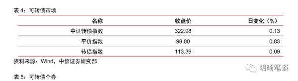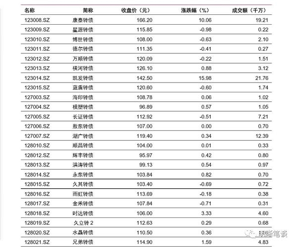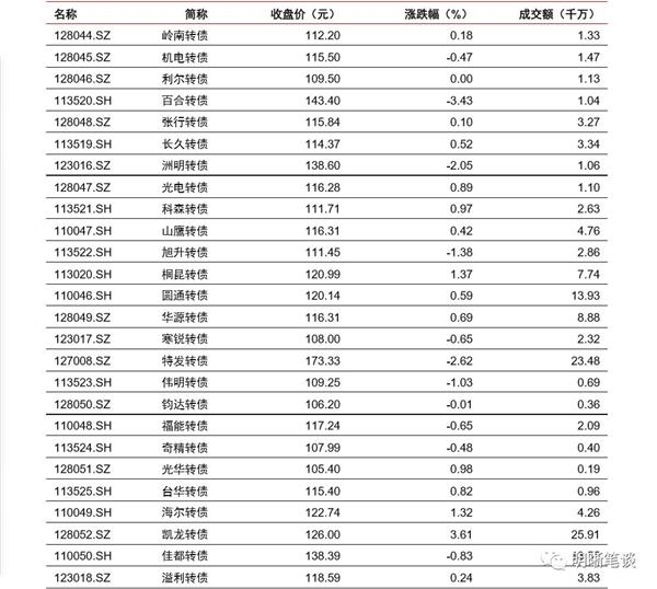3月27日转债市场,平价指数收于96.80点,上涨0.83%,转债指数收于113.39点,上涨0.09%。128支上市可交易转债,除利尔转债、敖东转债横盘外,63支上涨,63支下跌。其中凯发转债(15.98%)、康泰转债(10.06%)、冰轮转债(6.25%)领涨,百合转债(-3.43%)、特发转债(-2.62%)、曙光转债(-2.58%)领跌。128支可转债正股,除中化岩土、众兴菌业、东方雨虹横盘外,73支上涨,52支下跌。其中,康泰生物(9.99%)、凯发电气(9.97%)、冰轮环境(9.95%)领涨,中科曙光(-6.07%)、赣锋锂业(-4.33%)、辉丰股份(-3.91%)领跌。