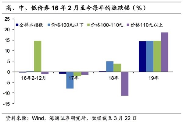 首先,16年2月以来中价券的涨幅(33.4%)明显高于高价券(2.3%)和低价券(11.1%),但过去几年市场风格有明显切换。其中中价券在16年表现较好,17-19年表现处于中间水平,整体来看表现最为稳健。而低价券在18年表现亮眼,17年表现不佳,综合来看表现也相对不错。最后高价券则在19年表现较好,18年则表现不佳,整体上是16年以来表现最差的。