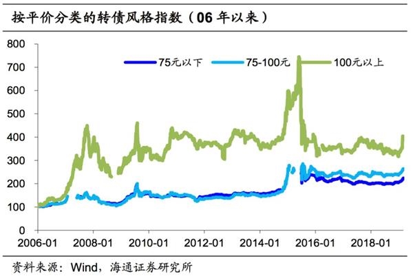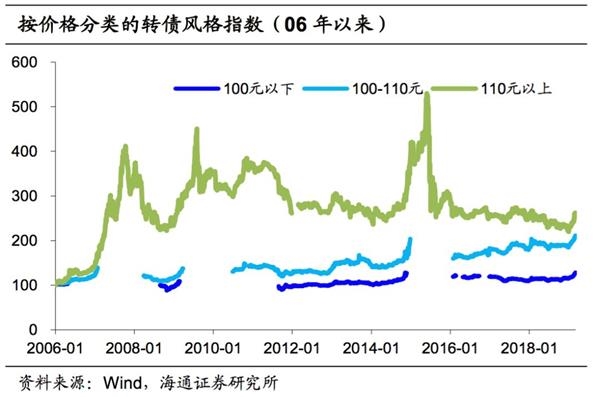 1)我们利用第一章中的构建方案来构建转债风格指数,分类标准之一是按照转债价格,即分为低价券(转债价格低于100元)、中价券(转债价格在100元-110元)和高价券(转债价格高于110元)。选择划分标准的依据,是三类转债历史的平均规模比较相近。