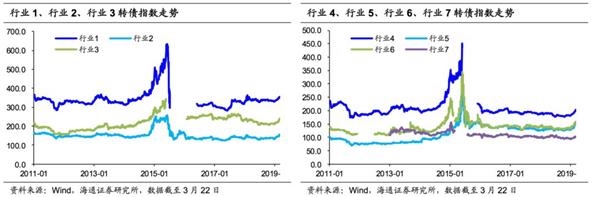 按照表1的分类标准,以及1.2中的指数编制方法,我们尝试构建转债行业指数,结果如下图所示。同样是受到15年牛市的影响,大量转债转股退出,导致指数的连续性相对较差。