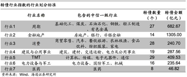 首先最重要的就是行业划分,虽然转债覆盖行业已经较为全面,但毕竟个券数量较少,因此很难按照股票行业指数的标准来划分。我们根据目前转债市场的个券情况,结合中信行业指数的划分标准,将转债指数划分为7大行业,分别是:周期、金融地产、消费、建筑与公用事业、TMT、电力设备与军工、医药,具体如下: