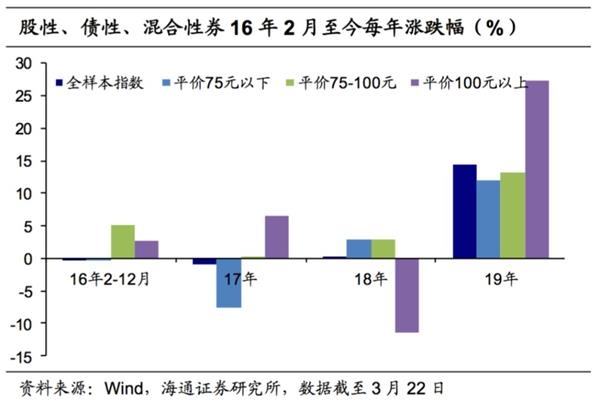 其次,16年2月以来股性券的涨幅最高(23.3%左右),与混合性券的涨幅相当(22.7%左右),而债性券涨幅最低(5.9%左右)。具体来说,混合性券在16年涨幅最高,17-19年处于中等水平,整体的表现最稳健。而股性券在17年和19年有明显的超额收益,18年则大幅下跌,整体表现有很强的波动性。最后,债性券仅在18年表现较好,其余年份表现均较差。