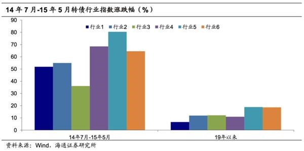 我们在19年转债年度策略报中曾分析过,在经济下行、融资回升、货币宽松的宏观背景下,成长股会有估值修复行情,周期板块则面临下行压力。从19年的表现来看,以TMT、电力设备、军工等为代表的偏成长板块表现也确实较为突出。特别的,如果我们统计上一轮牛市(14年7月-15年5月)各行业指数的涨跌幅情况,可以发现上一轮牛市中表现较好的是行业4、行业5和行业6,同样是偏成长风格,与本轮市场风格和走势相似。