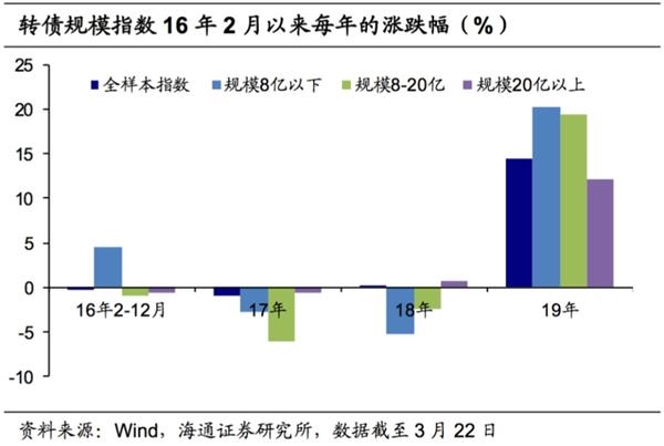 从历史走势来看,06年以来小盘券的涨幅整体最高,高于中盘券和大盘券。如果以16年2月为节点,则16年2月至今小盘券的涨幅为15.9%,高于全样本指数(13.28%),也高于大盘券指数(11.44%)和中盘券指数(8.44%)。不过最近三年间市场风格始终在变化,根据我们的计算结果,16年是小盘券行情,整体涨幅最高;17年-18年转债市场下跌,中小盘券表现一般,反而是大盘券更为稳健。最后,19年风格再次回到中小盘券,19年至今小盘券指数上涨20.33%,涨幅最高;大盘券指数仅上涨12.07%,涨幅最低。