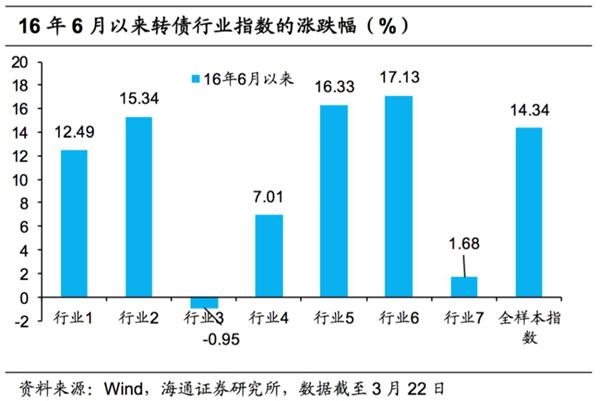 7大行业转债指数历史上的表现如何?根据转债行业指数的统计,06年以来行业指数涨幅排名为:行业1(涨幅258%左右)、行业3(涨幅145%左右)、行业4(涨幅106%左右)、行业6(涨幅59%左右)、行业5(涨幅58%左右)、行业2(涨幅53%左右)和行业7(涨幅4%左右)。不过同样考虑到15年左右曾有部分数据缺失,因此我们主要分析16年6月以来(受数据质量的约束)各类转债的收益情况。