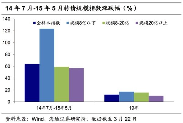 转债规模指数的统计分析。06年以来小盘券的涨幅高于中盘券和大盘券,而16年2月至今小盘券的涨幅同样高于大盘券和中盘券。具体来看,16年以来大盘券指数最稳健,收益始终处于中等水平。中盘券16-17年表现较差,18年-19年表现较好,收益逐渐上升。小盘券的波动最大,16年和19年表现最好,17年和18年表现较差,是综合收益最高的券种。此外,上一轮牛市(14年7月-15年5月)中,同样出现小盘券涨幅高于中盘券和大盘券的现象,与目前风格类似。