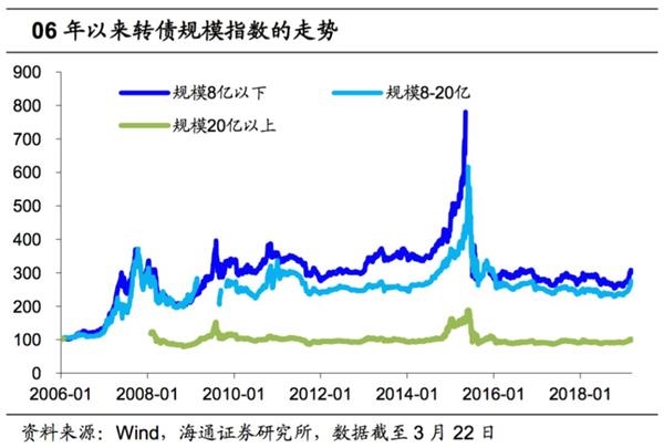 构建转债规模指数。转债规模的大小与个股的行业、规模,以及转债的流动性有较强的相关性。我们按照以下标准进行分类:大盘券(规模在20亿元以上)、中盘券(规模在8-20亿元)和小盘券(规模在8亿元以下),来构建转债规模指数。
