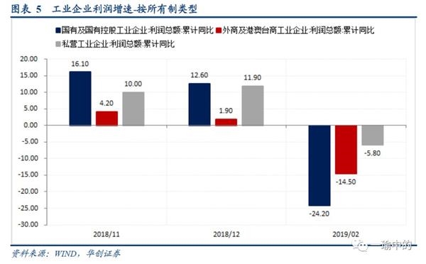 下游消费品制造业和受益于基建补短板、地产施工回升行业利润边际改善。按构成来看,1-2月电热燃水利润总额增长0.9%,而制造业利润同比下降15.7%,大于采矿业的-12.6%。制造业分行业来看,上游原材料加工业是主要拖累,除了非金属矿物制品业利润同比实现正增长外,石油、化工、黑色和有色金属利润同比分别下降70.4%、27.2%、59%和34.5%;中游装备制造业中,与出口相关度较高的电子设备利润同比下降21.6%,而交运设备和电气机械设备利润增速则分别增长83.7%和10.9%;汽车行业利润同比下降42%,扣除汽车以外的消费品制造业利润整体回升,其中食品制造业、烟草和酒、茶和饮料制造业利润改善明显,分别增长11.2%、18.2%和23.3%。装备制造业中交运设备和电气机械设备利润增速改善,或受益于基建补短板带来的行业景气度改善,同时电气机械行业利润增速历史上与地产施工保持一致,关注地产施工和竣工回升对相关行业需求的边际拉动;下游消费品制造业利润的改善或受益于CPI-PPI收敛带来的上游对中下游利润挤压的显著改善。所有制类型来看,1-2月利润降幅呈现国企>外资>私企的格局,与中下游利润好于上游保持一致。