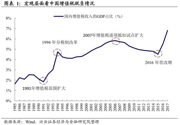 2016年5月1日起,全国范围内全面推开营业税改征增值税(以下称“营改增”)试点,建筑业、业、金融业、生活服务业等全部营业税纳税人,纳入试点范围,由缴纳营业税改为缴纳增值税。增值税税基扩大,增值税收入在GDP占比再次快速提升,从5%上升到2017年的7%。