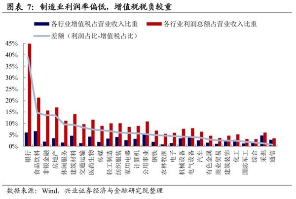 从另外一个维度上,我们对比各行业增值税占比重和各行业利润总额占营业收入的比重之差来观察各行业税负程度。如下图所示,通信行业利润占比与增值税占比之差最小,银行和食品饮料行业具有最高的利润占比,但是增值税占比相对较低。因此从行业利润率层面来看,中国增值税税负较重的行业主要体现在制造业上。制造业是增值税减税的主攻方向。