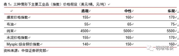 设定悲观、中性、乐观三种情形,三种情形下工业品价格由低到高。乐观情形下,主要工业品价格均回升到2018年最高水平;中性情形下主要工业品价格上行到2018年中枢水平;悲观假设下主要工业品价格回到2018年最低点。