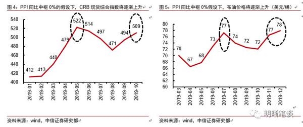 PPI变化与大宗商品价格存在较高的联动性,如果直接用CRB现货综合指数与布油价格变化拟合PPI同比可以在一定程度上取得较好的拟合效果,但要获得PPI预测值就又陷入了对大宗商品价格预测的难题中。换一个角度,如果PPI同比增速保持在0%的水平,需要油价和CRB现货指数达到多少?
