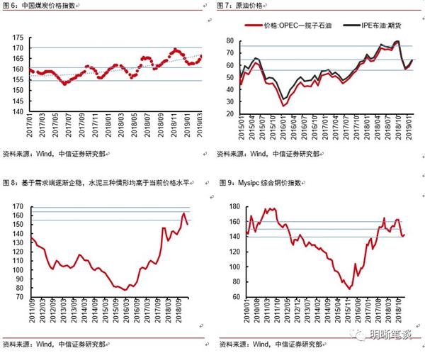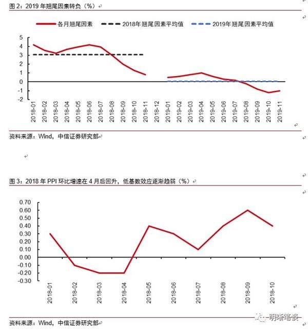 翘尾因素和基数效应共同趋弱,PPI趋于下行。经过计算,2018年PPI对2019年同比增速的翘尾因素为0.67%,比2018年下行3个百分点。分月来看,各月PPI同比增速的翘尾因素分别为:1月0.49%,2月0.59%,3月0.79%,4月0.99%,5月0.59%,6月0.29%,7月0.19%,8月-0.21%,9月-0.80%,10月-1.20%,11月-1.00%。可以看出,翘尾因素的影响值自4月到达高峰后逐月走弱。同时,去年4月份之前PPI短期下滑,使得基数走低,此后PPI增速回升对今年PPI的低基数效应将减弱。因此,翘尾因素小幅回升叠加低基数效应,PPI同比可能会在二季度短时企稳,随着基数效应的减弱和翘尾因素的趋弱,此后PPI走势将呈现逐渐走低的运行态势。