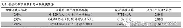 18年5月,制造业增值税税率从17%下调至16%,在19年4月,制造业增值税税率又进一步下调至13%。我们预计这两次增值税下调合计减税规模约1.2万亿,其中在19年生效的部分约7000亿,再加上2000亿的小微企业减税,19年企业增值税合计减税金额或达9000亿。