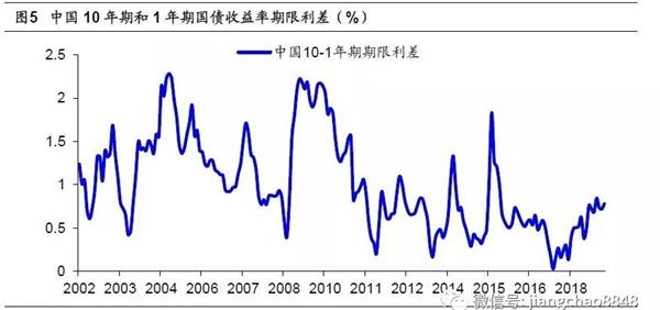 在2017年6月,中国的国债利率曲线也曾经倒挂过,当时中国的1年期国债利率也一度高于10年期国债利率。但是从17年下半年开始,中国利率曲线就开始重新变陡,目前10年期国债与1年期国债的利差已经恢复到60bp左右。