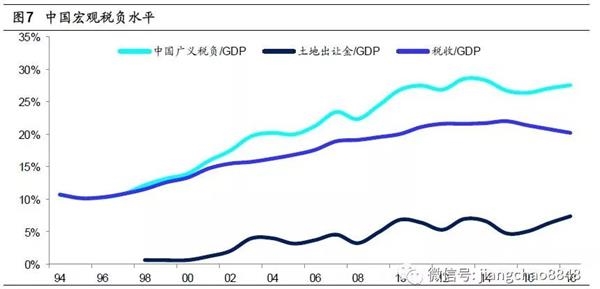 在1994年之后,中国的宏观税负水平就持续上升,以税收占GDP的比例来衡量,1994年时中国的狭义宏观税负水平仅为10.7%,而到2015年时最高达到22.1%,到2018年依然高达20.4%。