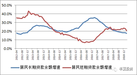 在上面的图上,如果我们以2017年初为分界,会发现:之前居民长期贷款增速持续走高,但短期贷款增速并不高,而之后长期贷款增速下行,短期贷款增速快速回升,当前已经高于长期贷款增速。